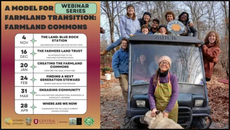 Join The Farmers Land Trust and Central State University Extension for this six-part speakers series featuring community members from the Blue Rock Station Farmland Commons. During these sessions, they will explore the farmland commons model, how Blue Rock Station farmers decided to used it in their farmland transition, and more.